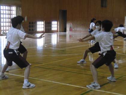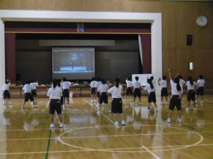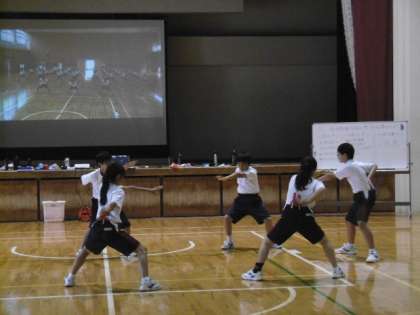 1年1組の保体の授業です。ダンスの領域で「YOSAKOIソーラン」を扱っていました。「仲間と動きを合わせ、統一感のある踊りにしよう」が本時の課題です。ビデオの模範演技を見ながら全体で踊ったりグループで確認し合ったりすることを通して、最初と比べると最後にはとても統一感がある踊りになったようです。