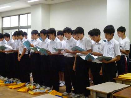 3年生は音楽室で学年集会です。学年合唱の練習も行っています。少しずつきれいなハーモニーができてきていますね。
