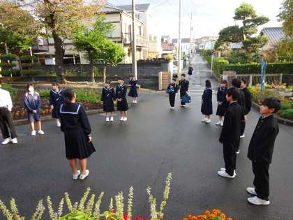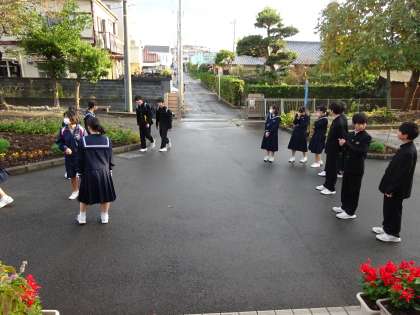 校門付近であいさつ運動を行っています。明け方の雨も上がり、さわやかな秋晴れです。1日が気持ちよく始まるように、お互いにあいさつを交わしていきましょう。