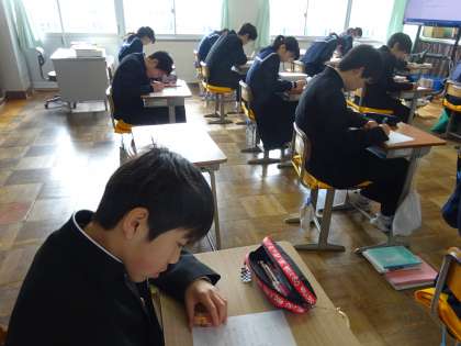 2年1組は国語の授業です。聞き取りテストを行っています。メモをしながらしっかり聞き取り、問題に答えていますね。