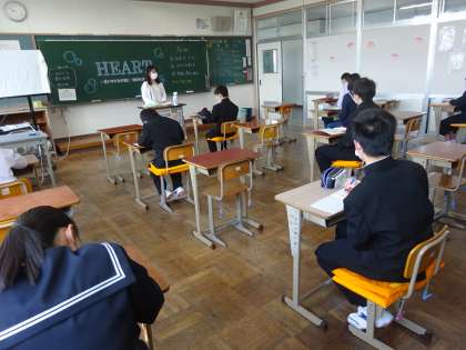 教室では担任が出迎え、提出物の確認やこれからの生活についての話をしています。