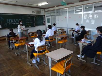 玄関での健康チェックの後、教室で提出物の確認やこれからの生活についての話をしています。