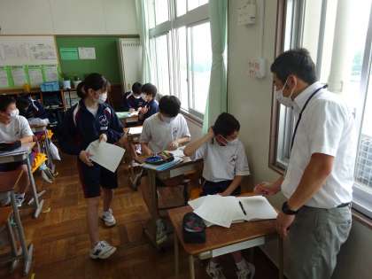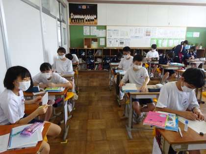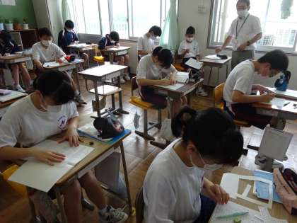 2年2組は数学の授業です。各自でテーマを決めインタビューしたことを、度数分布表にまとめています。