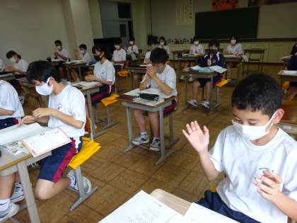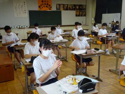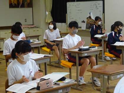 2年2組は音楽の授業です。「宿命」の曲を聴きながら、リズムをとる学習です。「Official髭男dism」の曲ですね。