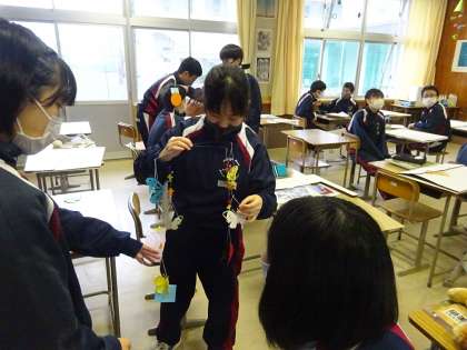 2年2組は美術の授業です。以前制作した、モビール作品を返却しています。
