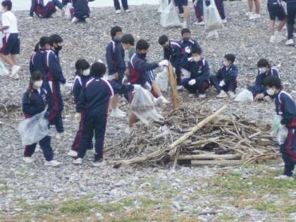 網を引く合間に、生徒全員で海岸清掃(流木拾い)を行いました。保護者ボランティアの方も10名ほど参加し、活動を支えてくださいました。本校は、こんなに素晴らしい海岸のすぐそばに位置しています。地域に住むわたしたちは、千本松原と海岸線の美しい景観を守る責務があると思います。「ゴミを捨てないようにしてほしい」と語った網元さんの言葉が心に残りました。よい体験をさせていただき、ありがとうございました。