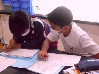 融解にかかわる実験グラフについての考察をペアで行っていました。実験するとグラフに多少の誤差が生じますが、その原因を予想することも、深い思考につながりますね。