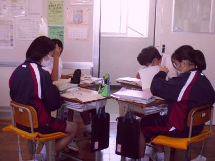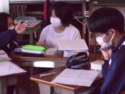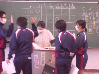 活用のある自立語を見つけ出し、品詞名、活用の種類、活用形をこたえられるように、グループで相談し合っていました。考え方のこつをつかんでほしいと思います。