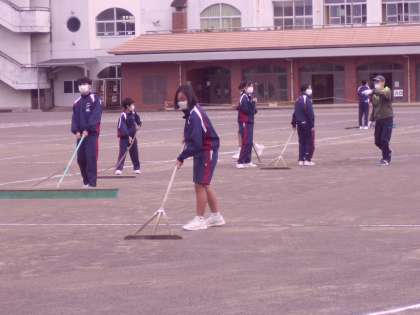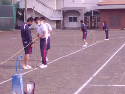 虎ロープをトラックの周囲に張りました。生徒の応援席はその内側、保護者の皆さんはその外側となります。よろしくお願いします。