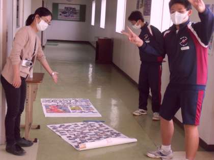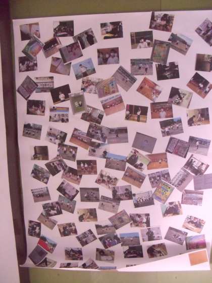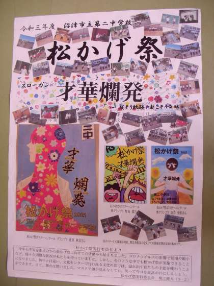 松かげ祭優秀ポスターのまわりに、生徒一人一人のこれまでの取組写真が飾られました。本番までのプロセスを大事にした取組です。