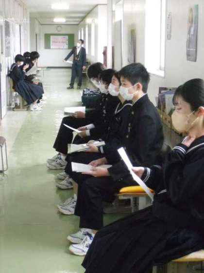 面接会場の出入り動作・座り方・礼の角度等、昨日のマナー講座を思い返しながら取り組んでいました。事前に記入した面接シートどおりに質問があればよいのですが、思いもよらない質問や答えた内容についての再質問があり、慌てた生徒も多かったことと思います。自分の言葉で考えを整理して明確に述べることの大切さを感じたことでしょう。3年生の皆さん、お疲れ様でした。