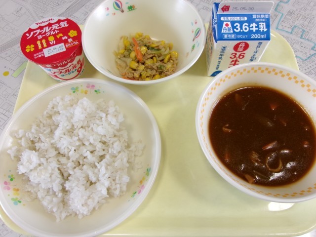 今日のメニューは、麦ごはん、牛乳、ハヤシライス、キャベツとツナのソテー、ヨーグルトです。