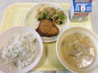 今日は「ふるさと給食の日」。メニューは、ツナごはん、牛乳、黒はんぺんのお茶フライ、厚揚げと玉ねぎのみそ汁、果物(冷凍みかん)です。