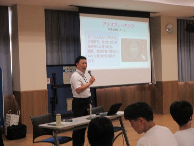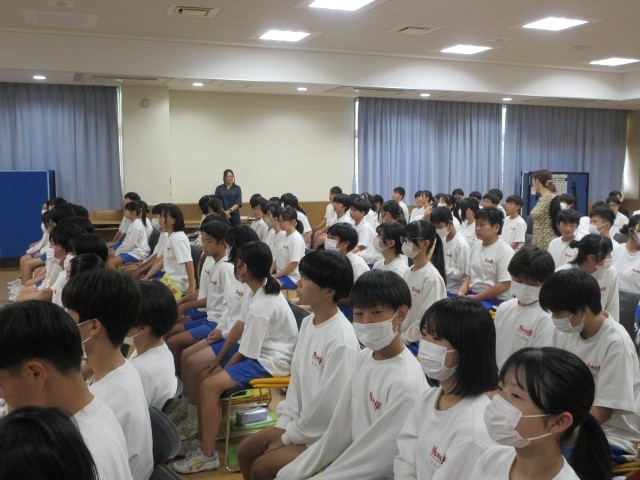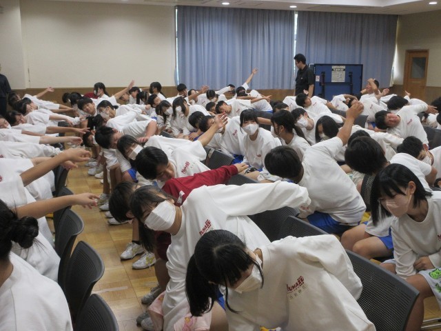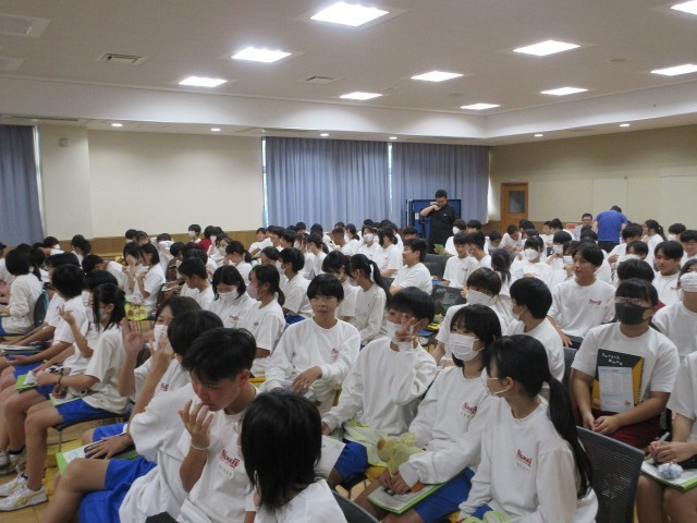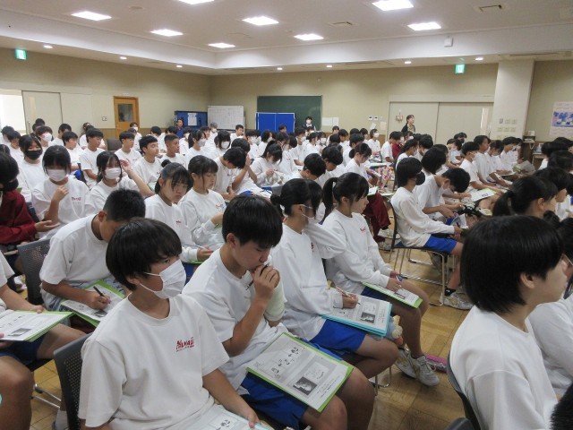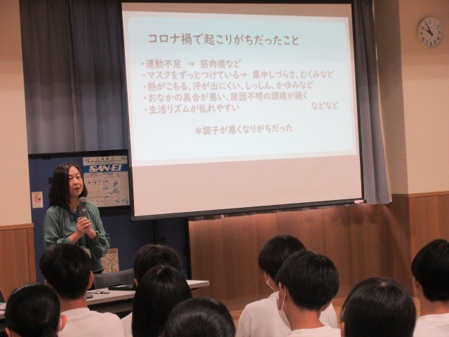 青少年センターと健康づくり課の先生方をお迎えしストレスマネジメント講座を行いました。ほどよいストレスは人を成長させること、頑張らなくてもよいときがあるとの言葉に生徒も安心して耳を傾けていました。ストレス解消のストレッチやセルフハグなどすぐに実施できる工夫も紹介されました。サポーターをたくさん見つける大切さを知り、生徒たちは心強さを感じていました。身近な生活の中でできるストレス対処法を学び、心が少し軽くなる時間となりました。生徒の表情にも「ほっとした笑顔」が広がっていました。