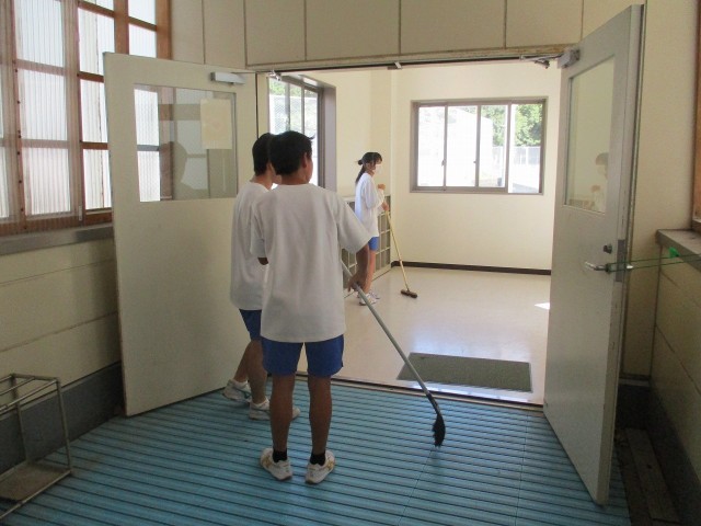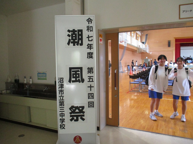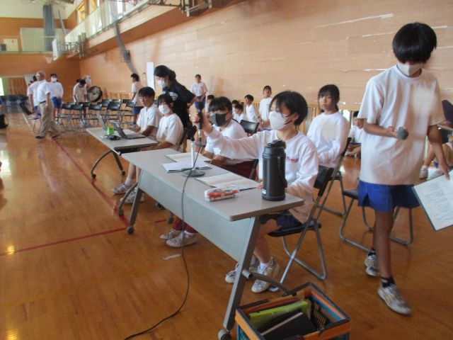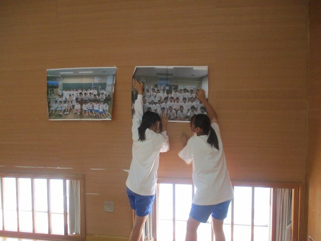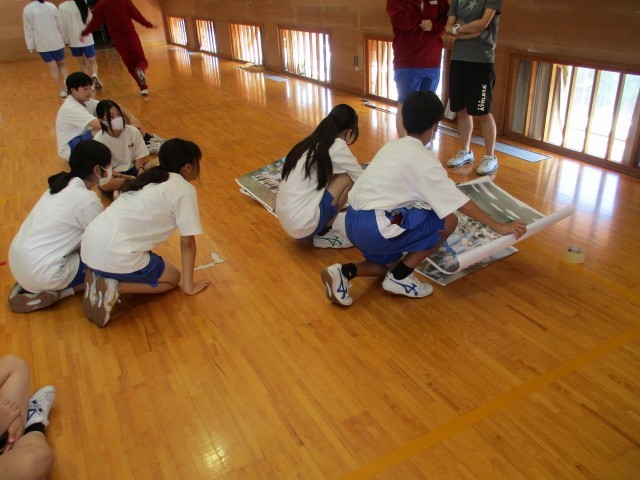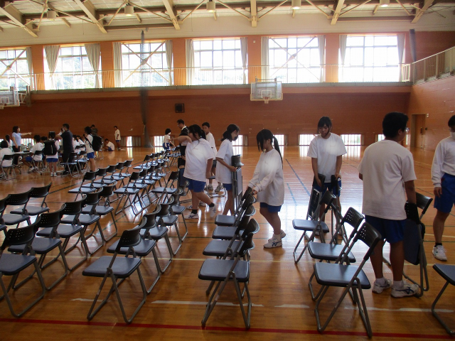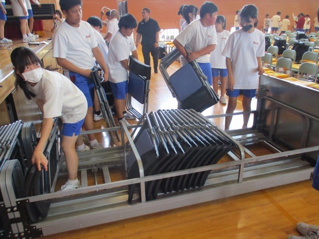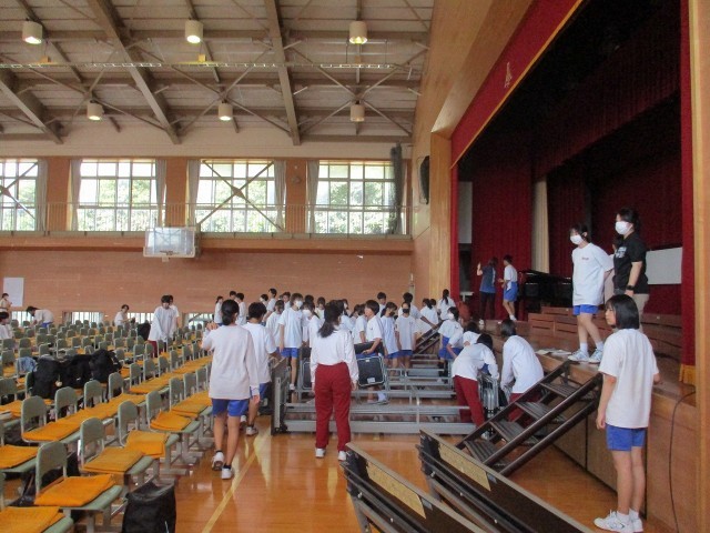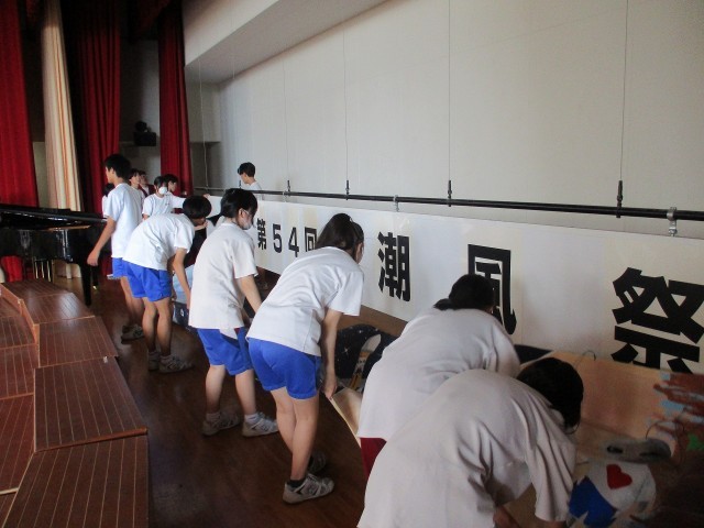 明日の潮風祭に向けて、合唱の部の係の生徒たちが協力して会場準備を行ってくれました。