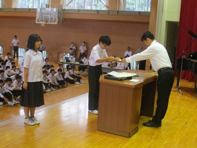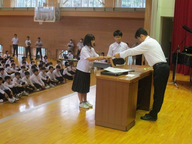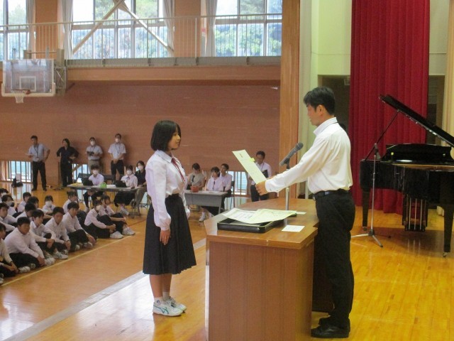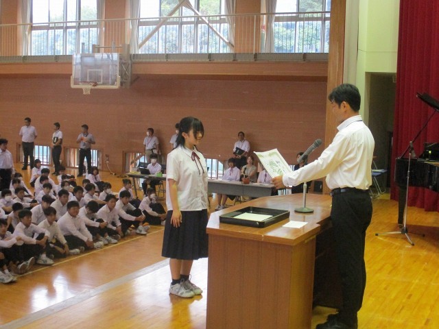 夏休み中から9月いっぱいにかけて文化的活動で表彰を受けた生徒及び部活動の表彰を行いました。
