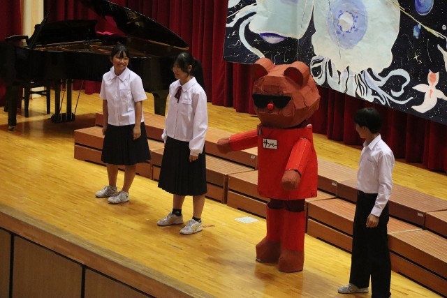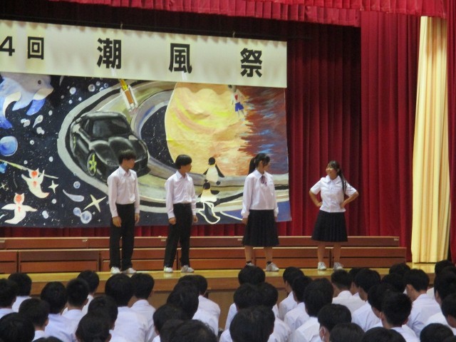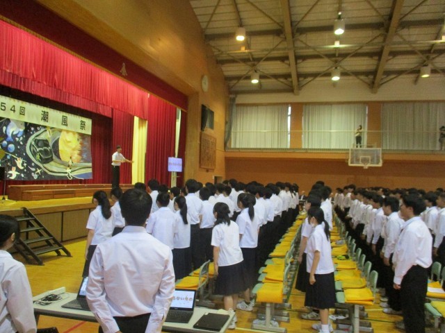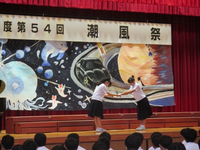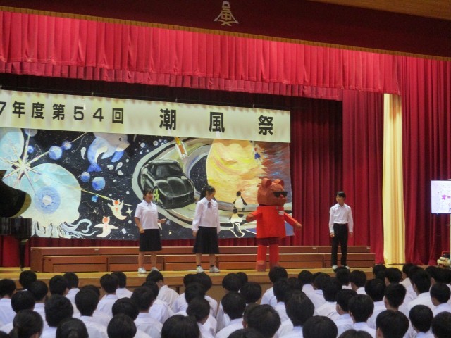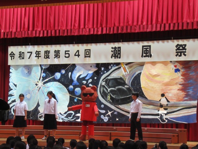 各クラスに依頼した意気込み動画を上映したり、今年度新たに設定した三中キャラ「サンべー」が登場したりと、潮風祭の幕開けにふさわしい時間となりました。