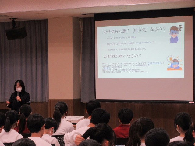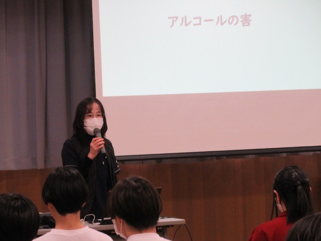 本日、学校保健委員会の取組みとして、2年生を対象に「飲酒を勧められたときの断り方を学ぼう」をテーマに授業を行いました。講師として、薬剤師の春田先生をお招きし、飲酒が心身に及ぼす影響について、専門的な視点から分かりやすくご指導いただきました。授業では、知識を一方的に学ぶだけでなく、実際の場面を想定しながら「どのように断るか」「自分の意思をどう伝えるか」を考える活動も行われました。生徒たちは、自分自身を守るための選択や行動について真剣に向き合い、具体的な言葉や態度の大切さを実感している様子でした。今回の学びを通して、生徒一人一人が自ら考え、判断し、行動する力を身に付けるとともに、将来にわたって健康な生活を送るための土台となることを期待しています。