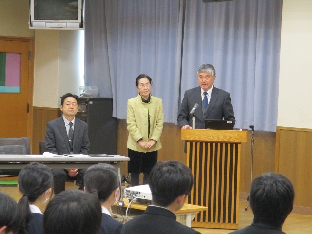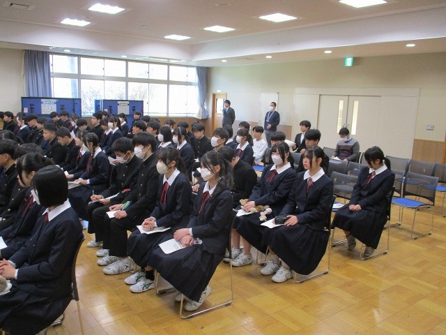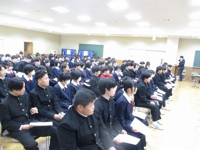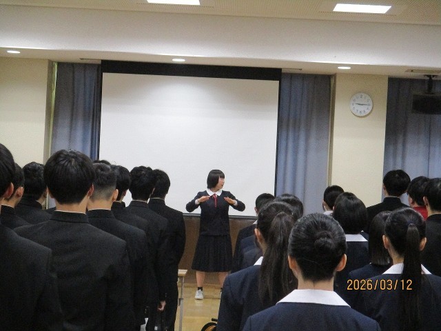 卒業式が日に日に近づいてきましたが、本年度も第三中学校同窓会役員様にご来校いただき、第78期となる同窓会入会式を行いました。会長様はじめ各役員様には温かい励ましの言葉をいただきました。ありがとうございました。お話の中にもありました「桃咲く丘に」を歌える諸先輩方が数多くいること、その先輩方が日本をはじめ世界各地でみなさんを応援してくれていることを再認識する中で、これから社会人の一人になる3年生の大きな励みとなりました。会長様の言葉をお借りして・・・「Good luck グッドラック」