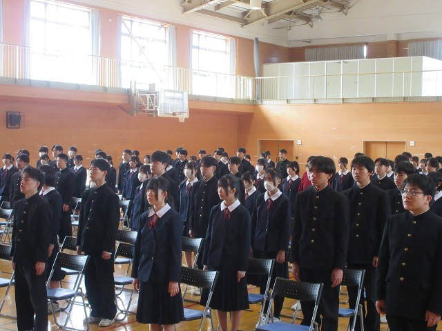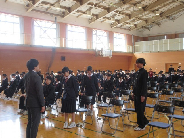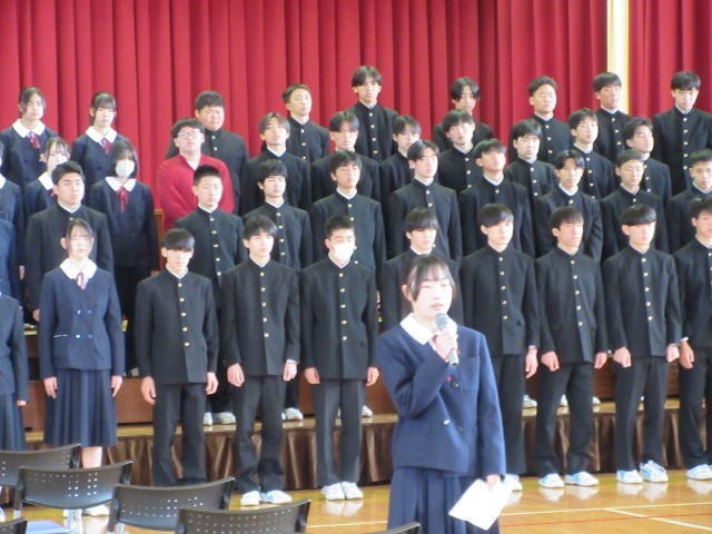 明日の卒業式を前に、最後の総練習を行いました。呼名、立ち振る舞い、式の流れ、どの場面でも真剣に向き合う3年生の姿がありました。その落ち着いた表情や凜とした背中に、3年間の成長を感じ、頼もしさを覚えました。特に記念合唱は、総練習と分っていても胸に迫るものがありました。いよいよ明日は卒業式です。3年生の皆さんは、これまで支えてくれた家族や仲間、先生方への感謝の思いを、自分らしい姿で精一杯表してほしいと思います。明日、皆さんの晴れ姿を見ることを、心から楽しみにしています。