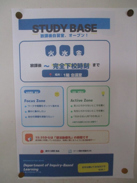 Study Baseの様子です。今日も、一人で落ち着いて課題に取り組む生徒、友達や先生に教えてもらいながら学習を進める生徒など、自分の放課後を自分でデザインして過ごしています。