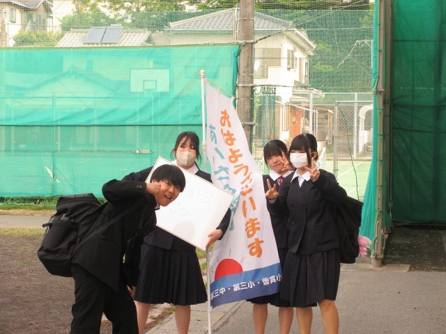 生活委員会の呼びかけで、朝の挨拶運動がスタートしました。三中の朝が、さらに明るく、元気に彩られています。生徒一人ひとりの笑顔と元気な挨拶が、学校全体に広がり、素敵な一日のスタートを切ることができています。この挨拶の輪が、みんなの心を温かくし、学校の雰囲気をより素晴らしいものにしてくれることでしょう。今日も元気に、笑顔いっぱいの朝を迎えましょう!