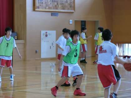体育館では、バスケット部男子が練習しています。