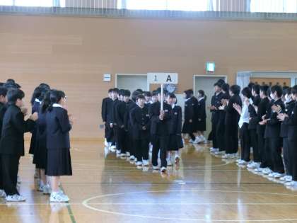 吹奏楽の生徒の歓迎の演奏の中、1年A組、1年B組が入場します。