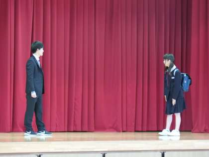 生徒会本部による「三中生の生活」の劇が始まりました。先生役で、天野先生が登場です。