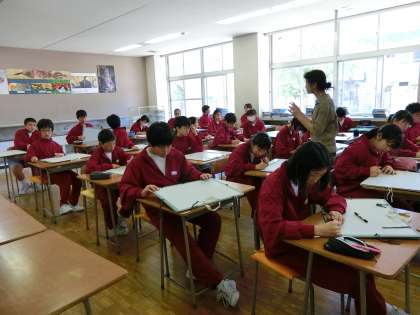 1年A組美術は、画板が一人一人配られ、名前を書いたり、使い方の説明を受けたりしています。