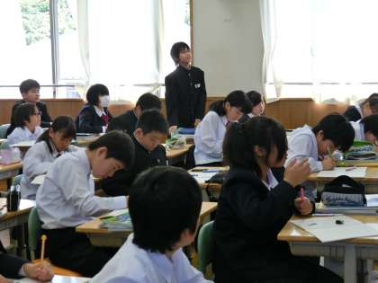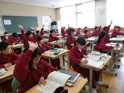 1年B組国語は、漢字の成り立ちについて、考えを発表しようとしています。