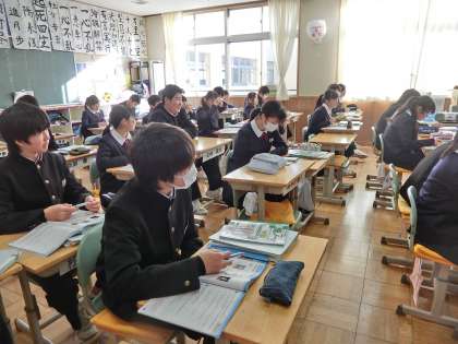 3年D組英語は、有名人の名言のリスニングを聞いて、意味を考えています。