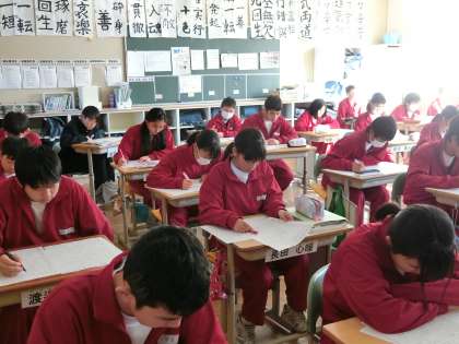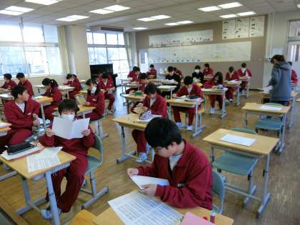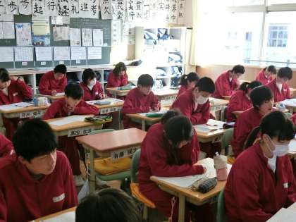 2年E組理科は、問題を解き、解答の確認と説明を受けています。