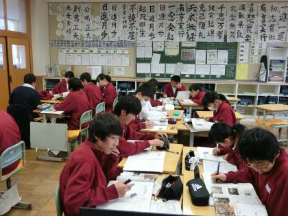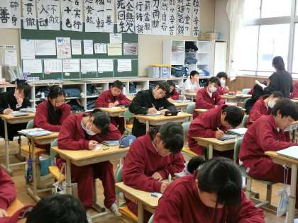 2年E組英語は、聞こえた単語を一人一人がノートに書く練習をしています