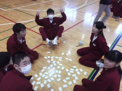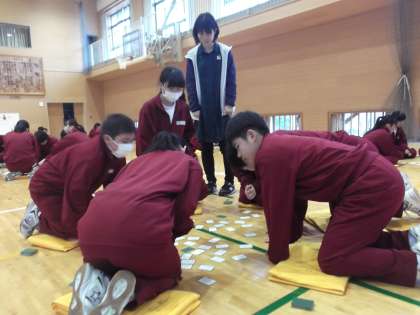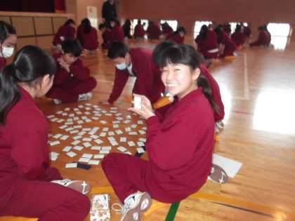 2年学年委員会が運営する『百人一首大会』が開催されました。クラス予選で決められた順位を元に、団体戦・個人戦のタイトルをかけて、グループごとに競い合いました。
