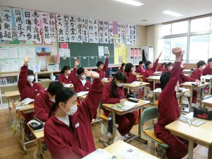 1年A組家庭は、衣服のはたらきを考えています。意欲的に発表しています。