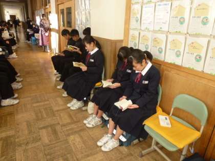 廊下での待ち時間、読書をしている生徒、じっと目をつぶって集中している生徒など様々です。いつもの自分を見てもらいましょう。がんばれ3年生!