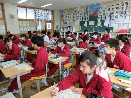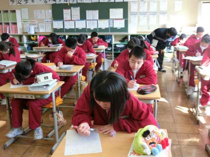 1年C組国語は、隣同士交換して漢字テストの採点付けを行っています。