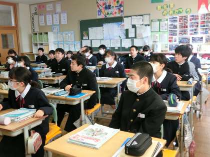 1年D組英語は、前時の内容の復習で、生徒に答えさせながら授業を進めていきます。