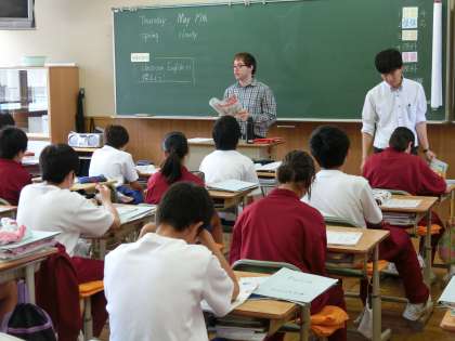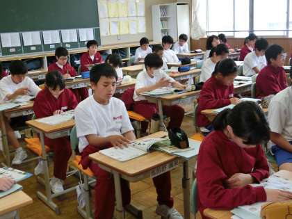 1年C組英語は、ALTの先生から発音を教わり、繰り返しています。