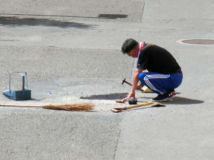 大橋副校長先生は、駐車場のコンクリートの部分が大きく欠け、生徒が歩行中にはまってしまいけがをすると困るので、長い時間をかけて修理してくれました。