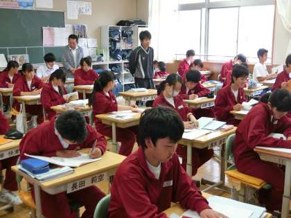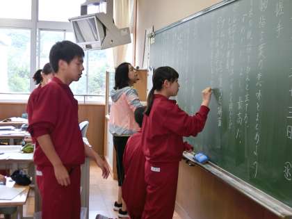 3年D組国語は、「握手」という教材で、課題に対する自分の考えを黒板に書いています。