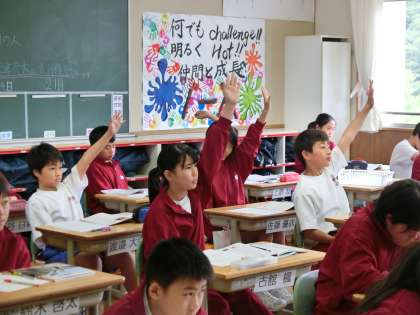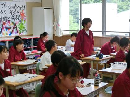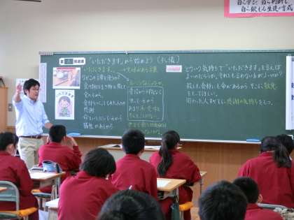 1年A組は、日本人は「いただきます」についてどんな想いを込めているか、自分の考えを発表する場面です。手がたくさん上がります。