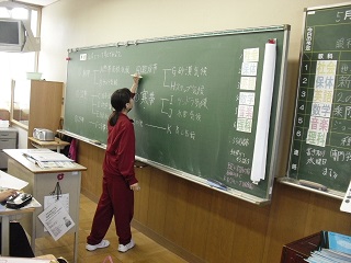 1年C組(社会)では、「世界各地の気候」について学習しています。世界各地の気候について、調べたことを生徒が板書し、どんな共通点があるか考えていました。