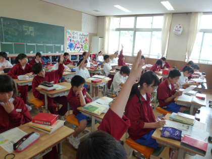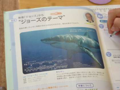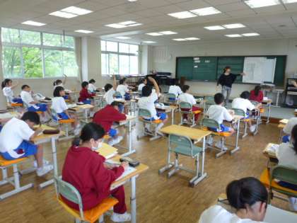 1Aは国語の授業です。ワークシート通信「国語の自作プリント」を使って富士山周辺の事を発表し合っていました。1Bは、音楽です。映画「ジョーズのテーマ曲」を聞いて感じたことやわかったことを発表していました。怖くて耳を塞いでいる生徒もいました。やはりなんとなく怖い曲です。