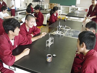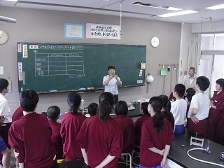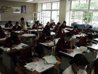 2E(理科):「スチールウールやマグネシウムを燃やすと質量はどうなるだろうか」を学習課題として取り組んでいます。班で、実験を行った後、演示実験において、マグネシウムを燃やし、質量が増えていることに驚いていました。前に集まっている生徒の目も真剣です。なぜ質量が増えたのでしょうか?