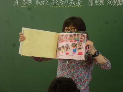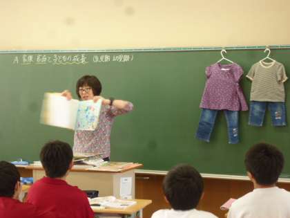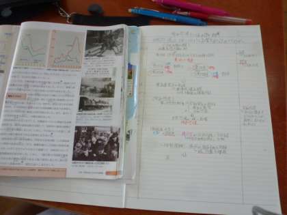 3Cの授業は社会です。「昭和恐慌と政党内閣の危機」きれいに整えられた3年生のノートです。3Dの授業は家庭科です。「幼児の心の発達」の授業でした。幼児の服や実際の絵日記を見て、少しずつ絵の内容が変わって心が成長している様子がわかります。