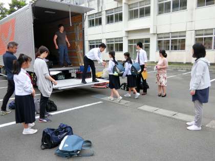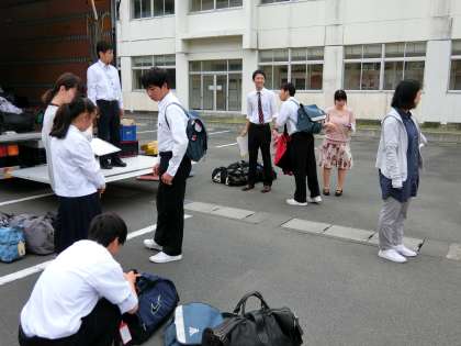 3年生は、大きな荷物を1日前に京都へ運んでもらうこととなっています。朝の登校時に、3年生は手荷物を抱え、先生方のチェックを受け、トラックに荷物を入れています。明日からの行事に気持ちが弾みます。