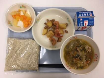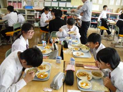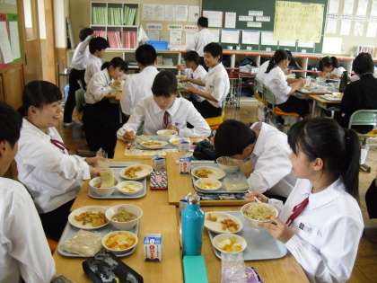 野菜たっぷりのタンメンが人気でした。写真は2年A組の給食の様子です。