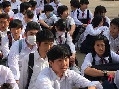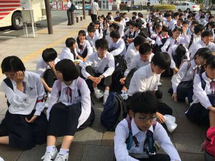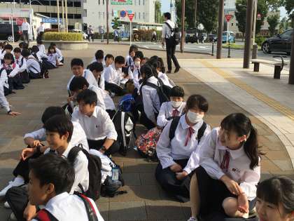 三島駅に到着しました。生徒は、楽しそうです。7.57発で出発します。